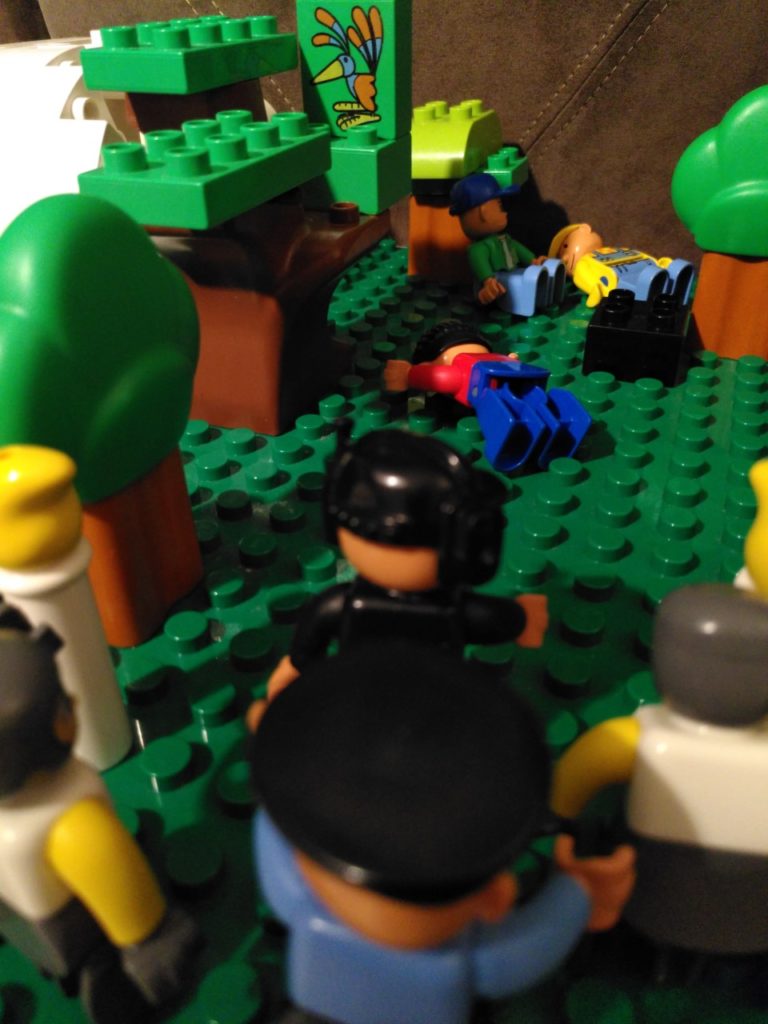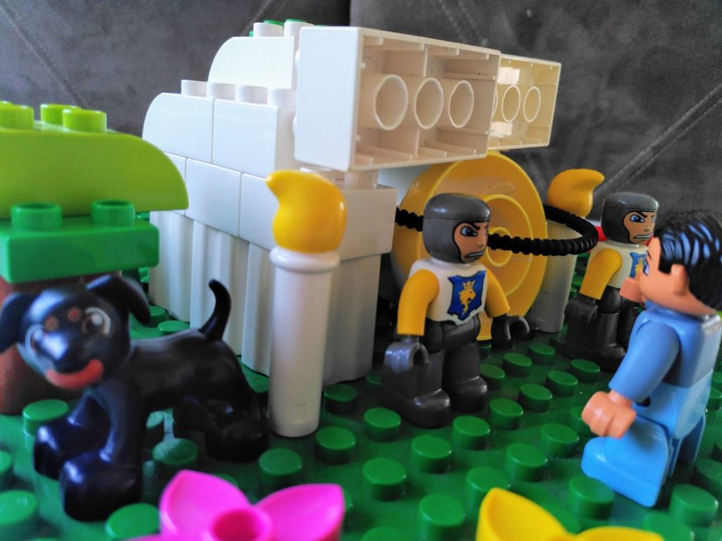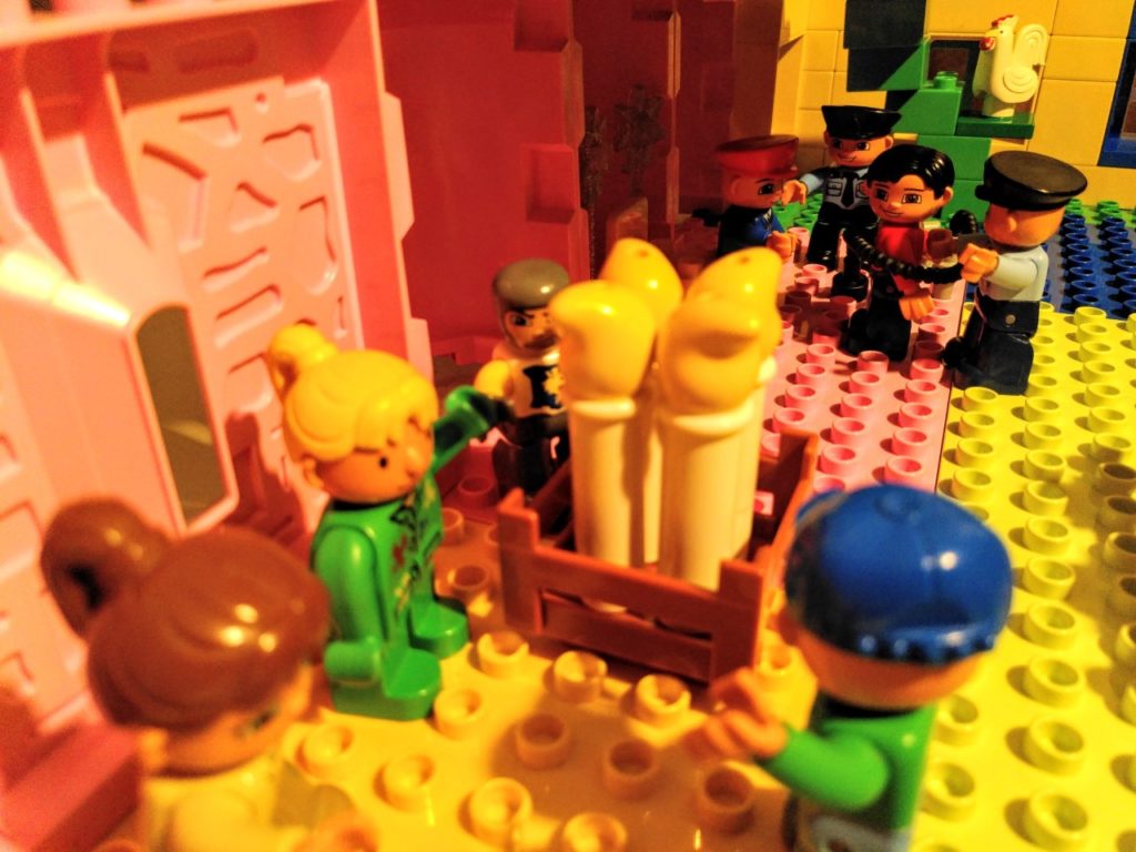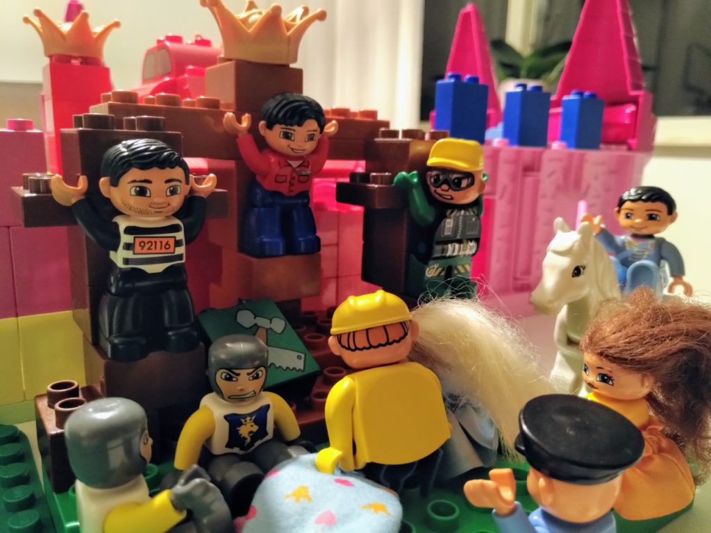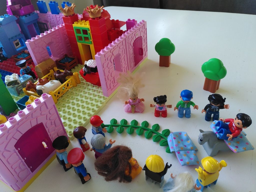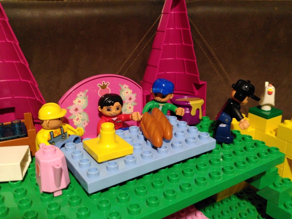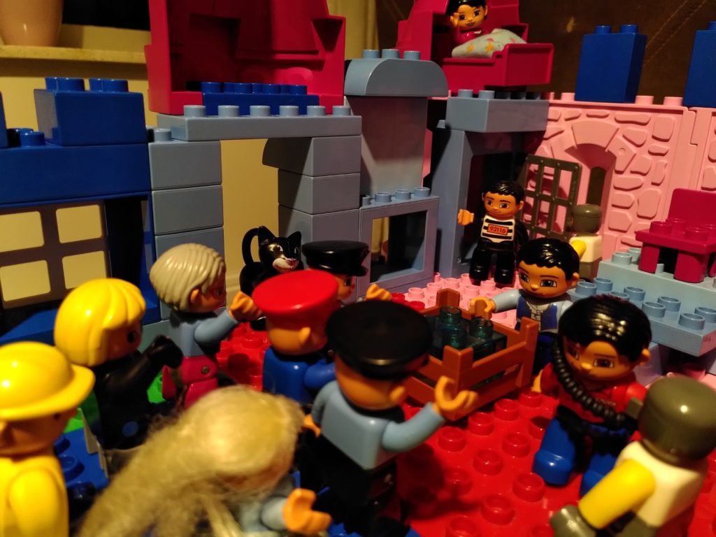 Voor deze staties hebben we dankbaar gebruik gemaakt van een paar sets van Duplo die de basis legden: prinsessenkasteel 4820 (en evt. 4821 voor paard en extra muur) was heel handig voor het optrekken van de muren van Jeruzalem, maar ook voor de vrouwen (Maria’s), Pilatus/ hoofdman/Josef van A., kronen als versiering van de tempel en symbolische bordje op Jezus’ kruis, kleren bij intocht en Golgotha, etc. Verder was ook de politieachtervolging 10532 heel bruikbaar voor de gevangenisdeur, Barabbas, priester/farizeeër, geld op het tempelplein en de marktkraam 5683 voor Petrus, de vrouw van Pilatus, de poes, brood en wijnbeker, kratten voor vuurkorf, wasvat etc. Tenslotte de details: Wat heb ik nog meer en kan ik ergens in het verhaal verwerken? Een laadbak als brandofferaltaar, een benzinepompslang als touw (creative auto’s), een cupcake vulling als grafsteen (mijn eerste taartjes) en kaarsjes als vuur en fakkels, bruine blokken voor Golgotha (my first celebration). Daarnaast konden we uiteraard ook veel boerderijdieren gebruiken! Gelukkig is er tegenwoordig veel duplo tweedehands verkrijgbaar (Marktplaats!) en zijn er zelfs winkels waar je losse figuren kunt kopen (waar wij de soldaten en een ezel vandaan hebben).
