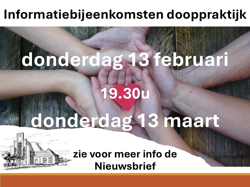 Donderdag 13 maart is de tweede informatiebijeenkomst over dooppraktijk: 13 maart informatiebijeenkomst dooppraktijk