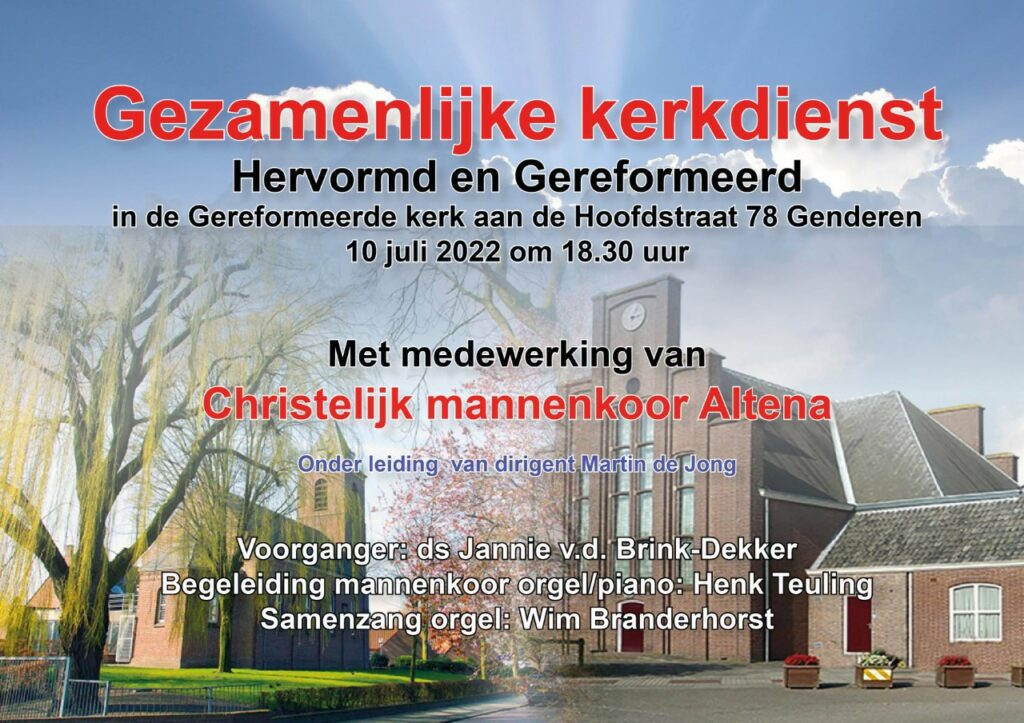 Van harte welkom 10 juli om 18.30 uur in de Gereformeerde kerk Genderen voor een feestelijke eredienst met medewerking van Christelijk Mannenkoor Altena onder leiding van dirigent Martin de Jong en begeleiding op orgel en piano door Henk Teuling. Voorganger ds. Jannie van den Brink-Dekker en samenzang begeleiding op het orgel door Wim Branderhorst.