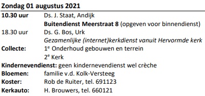 Bij slecht weer wordt de dienst in de kerkzaal gehouden, inschrijven vooraf via deze site aangezien voor binnendiensten het aantal zitplaatsen beperkt is. Er is geen kindernevendienst bij buiten- en binnendienst. Wel worden werkbladen uitgereikt. Oppas wel op beide locaties.