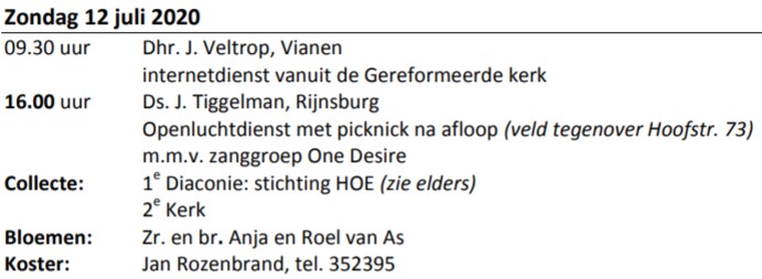Uitzending vanuit Hervormde Kerk, waar het Avondmaal voor Hervormden gehouden wordt. Geen mogelijkheid tot reserveren via deze site, uiteraard wel mogelijk tot meekijken of luisteren.