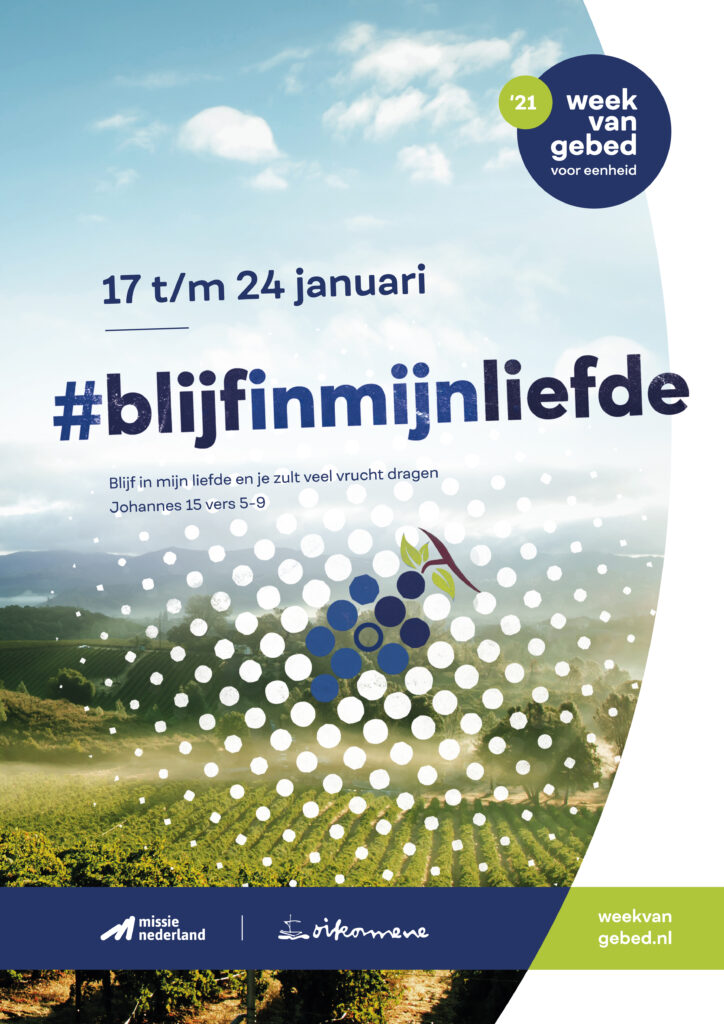De gebedsweek vindt in 2021 plaats van 17 t/m 24 januari. Het thema #blijfinmijnliefde verwijst naar een uitspraak van Jezus Christus uit Johannes 15. Hij zegt daar tegen zijn discipelen: ‘Blijf in mijn liefde en je zult veel vrucht dragen.’ Hij blijft in de liefde van de Vader en wil niets liever dan die met ons delen. Hiervoor gebruikt Hij het beeld van de wijnstok. Hij is de wijnstok en de Vader de wijnbouwer. Die snoeit ons en maakt ons heel, zodat wij hem kunnen eren en vrucht dragen. Vrucht die zichtbaar wordt in eenheid. Dat is wat we hopen dat er in deze Week van gebed voor eenheid gebeurt.