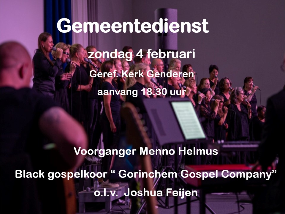 Het gospelkoor Gorinchem Gospel Company zal in deze dienst muzikale medewerking verlenen. We gaan luisteren naar prachtige black gospel dus stil zitten wordt lastig. Van harte welkom om te komen luisteren en mee te zingen! Naast eigen nummers is er ook samenzang. En dat allemaal onder leiding van Joshua Feijen en topband!