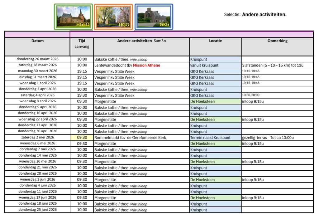 Samen met de Hervormde Gemeente Eethen Drongelen (HGED) en Hervormde Gemeente Genderen (HGG) wordt samengewerkt. Denk hierbij aan de Vakantiebijbelweek, gezamenlijke wandelingen en het startweekend. De gezamenlijke activiteiten worden naast de reguliere activiteiten in een kalender getoond: